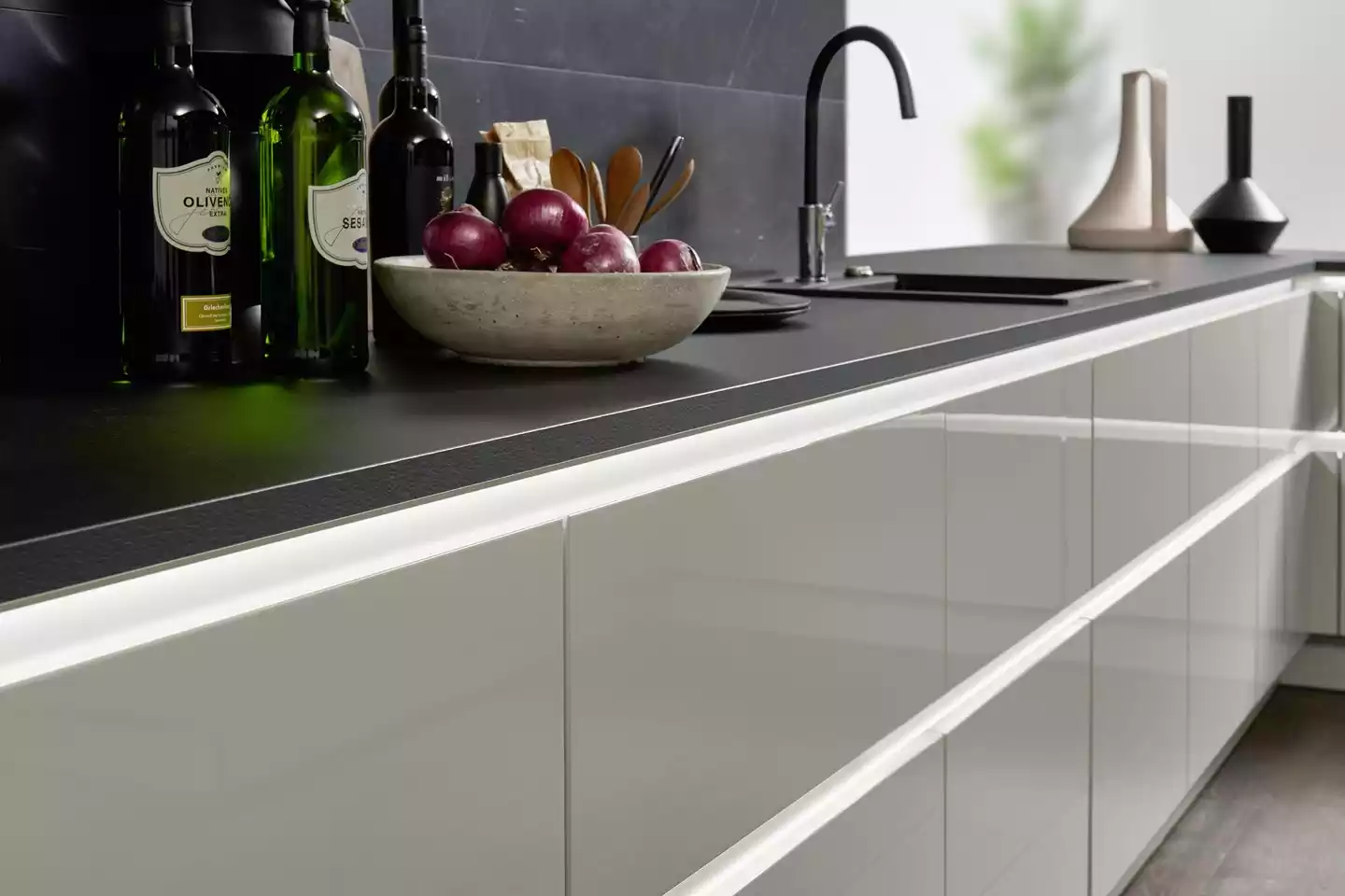 In order to prevent dust and moisture (e.g. steam) from penetrating and to ensure doors and drawers close quietly and gently, all our cabinets have a thick edge on the front that matches the colour of the cabinet. This thick edge also prevents light rays from the interior lighting escaping through the gap between carcase and cabinet door.